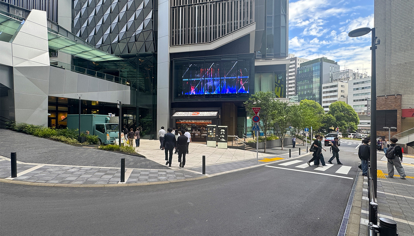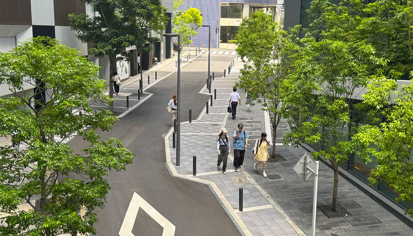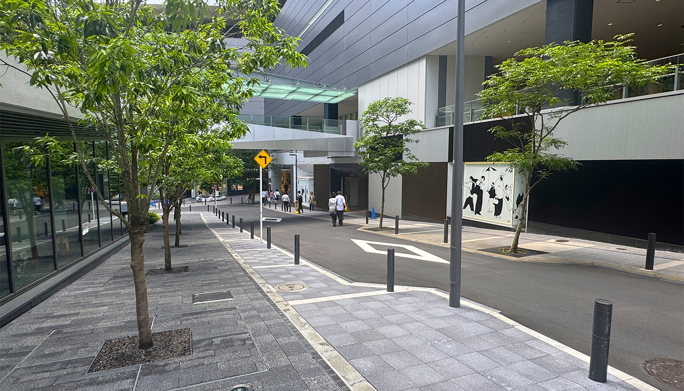 建物外周の道路等の基盤設計及び接続デッキに関する道路管理者との道路占用などの協議・調整を実施した。併せて設計範囲の工事監修として、道路管理者や交通管理者との行政協議、施工者との調整を実施した。
