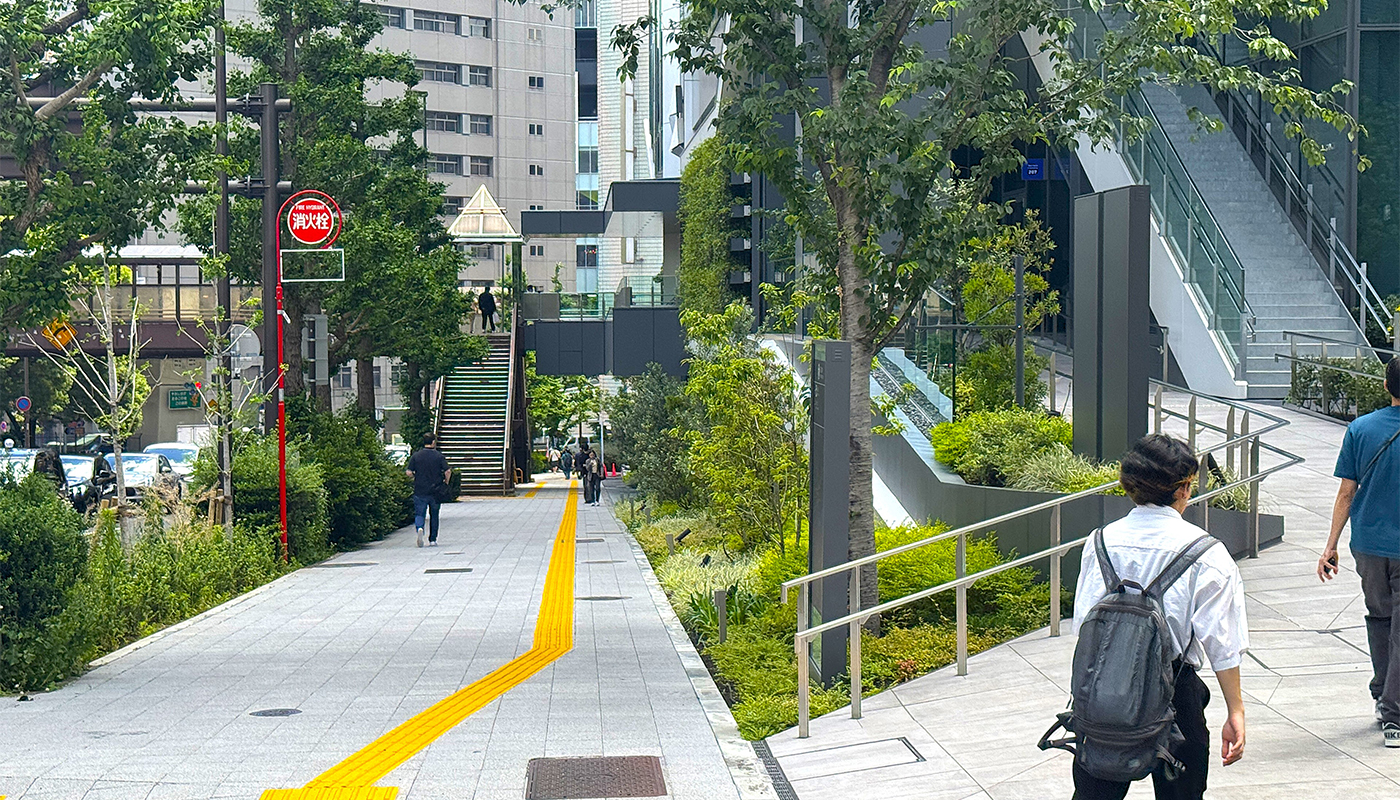 当該地区は、青山方面および南東側の渋谷クロスタワー方面への通行者が多く、これに対応するため歩道の整備および建物からのデッキ接続を介して、多層的な歩行者動線の形成を目指した。