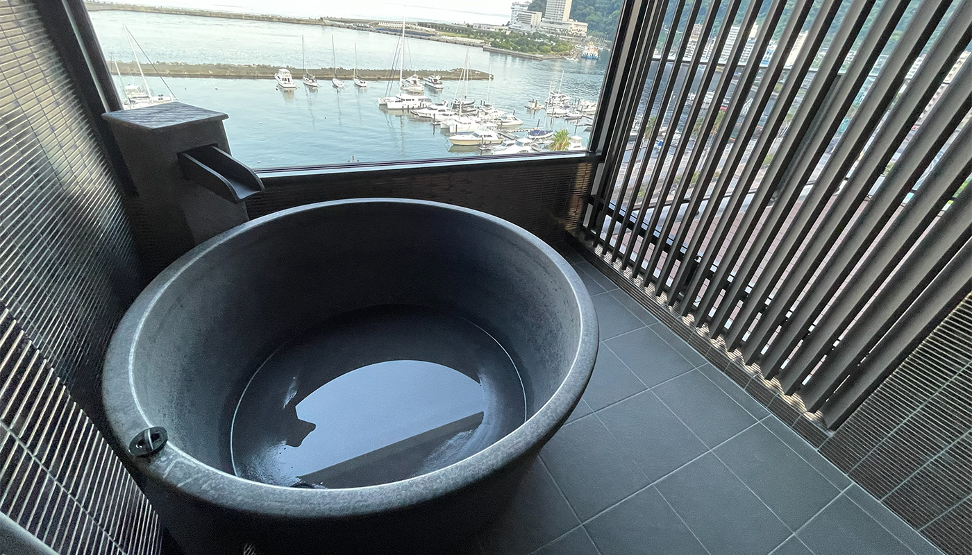 親しまれ続けてきた渚館と、伝統文化としての楠細工を継承した和風モダンを基調とし、海に突き出した客室浴槽空間は、温泉を楽しめる非日常体験を象徴的に表現しています。