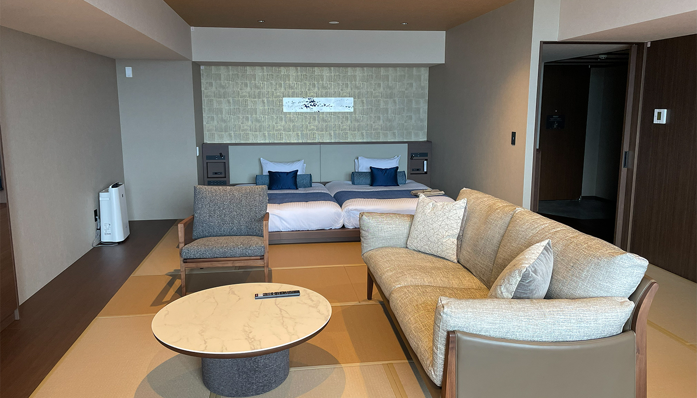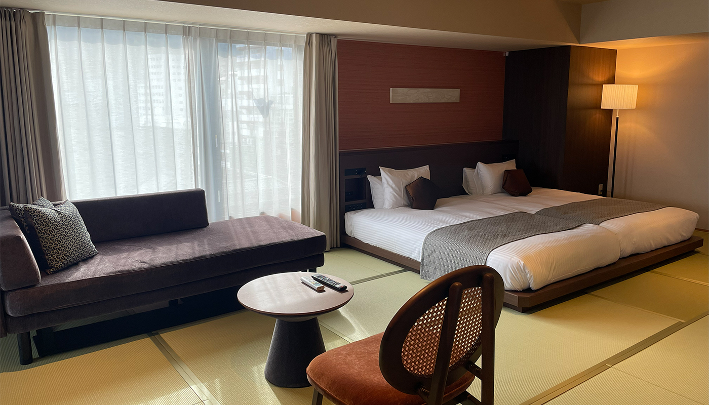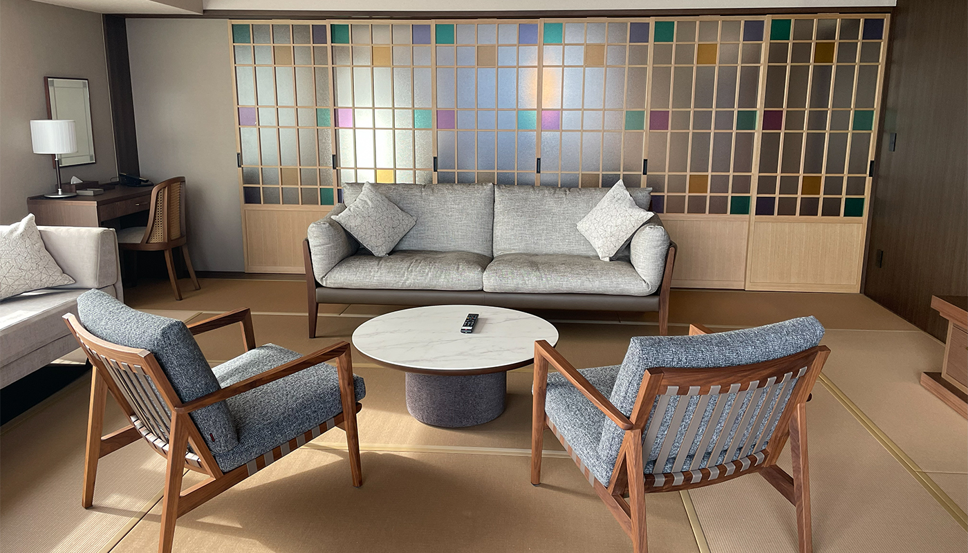 客室は、ゆったりとくつろげる畳空間と、食事を楽しめるダイニングエリアを和風モダンなガラス格子戸にて印象的に仕切れるしつらえがなされ、専用フロアでは愛するペットとともにくつろげる温泉リゾート施設が完成しました。